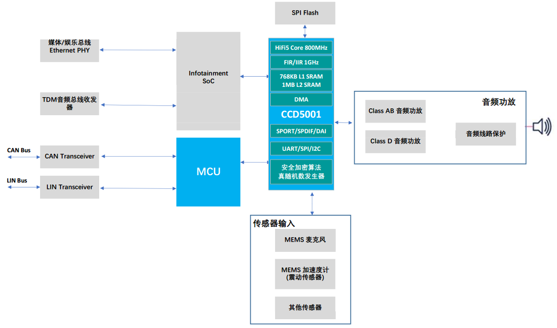 在FIR/IIR/FFT等音頻DSP任務中,CCD5001采用專用的硬件加速器執(zhí)行通用算法,如有限和無限脈沖響應(FIR和IIR)濾波,允許在內(nèi)核DSP 之外進行實時音頻濾波,從而提高內(nèi)核的有效性能,相較于同類芯片可提供最高2.5倍的性能;芯片具備豐富的音頻接口(SPORT、SPDIF)及內(nèi)建音頻子系統(tǒng)(DAI、PCG),能夠?qū)崿F(xiàn)8個TDM32、共計256個通道的并行輸入輸出功能,支持串聯(lián)拓撲,大幅簡化車內(nèi)線束連接,降低系統(tǒng)成本;芯片靈活的數(shù)據(jù)通路配置,高效的數(shù)據(jù)傳輸效率,覆蓋從低端到高端音頻系統(tǒng)擴展需求,豐富的外設(shè)控制資源能夠讓CCD5001方便集成到各種構(gòu)架的音頻管理系統(tǒng)的硬件平臺中。