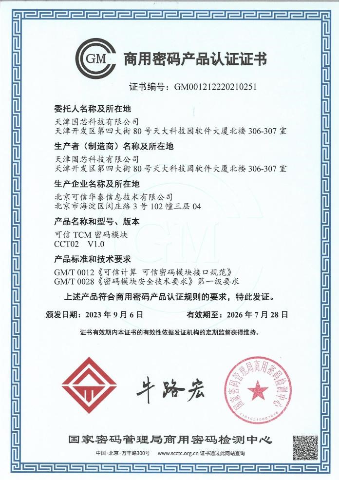 國芯科技和國內(nèi)領先的可信計算應用企業(yè)北京可信華泰信息技術有限公司(簡稱可信華泰)緊密配合,基于CUni360S及CCM3310S-H可信安全芯片設計了TCM2.0芯片模塊產(chǎn)品。上述產(chǎn)品符合”GM/T0012-2020可信計算可信密碼模塊接口規(guī)范”和”GM/T0028密碼模塊安全技術要求”。將TCM2.0芯片模塊設計在PC、服務器、網(wǎng)絡安全設備的主板上,通過修改BIOS配置的方式接入系統(tǒng),可信根在系統(tǒng)啟動時首先啟動,完成BIOS度量、操作系統(tǒng)度量、應用和服務度量,實現(xiàn)可信增強的計算環(huán)境,該方案的優(yōu)點是穩(wěn)定性高,集成度強。