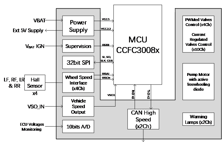 SBC功能,可為MCU提供穩(wěn)定的電源,支持看門狗實時監(jiān)測MCU工作狀態(tài); 內部集成8CH閥驅動控制,減少了閥驅動器的設計成本,可以低延時進行輪速WSS狀態(tài)讀取、診斷讀取,可以完成復雜制動控制邏輯;新增的2路電流調節(jié)閥驅動,功能上可以覆蓋ST的L9305。