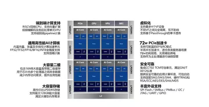 算力強(qiáng)大,內(nèi)置8個采用自主指令集的通用AI計算處理器,支持多種精度的高性能AI計算,整體算力160TOPS@INT8。