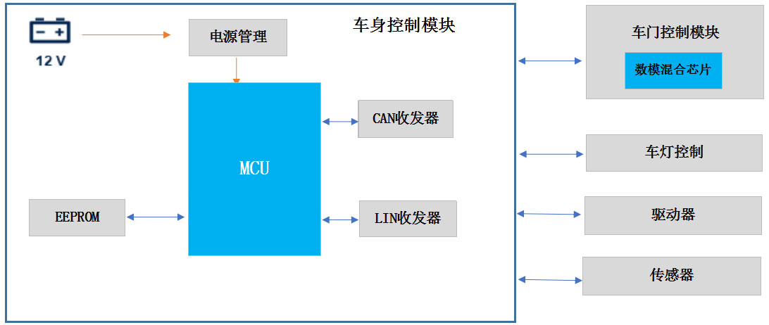 車身控制通過采集門鎖開關(guān)信號(hào)、車窗升降信號(hào)、雨刮信號(hào)、燈光控制信號(hào)等,通過驅(qū)動(dòng)繼電器或者驅(qū)動(dòng)IC直接驅(qū)動(dòng)各類電機(jī)和車燈,實(shí)現(xiàn)對(duì)車門、車窗和車燈等設(shè)備的控制。