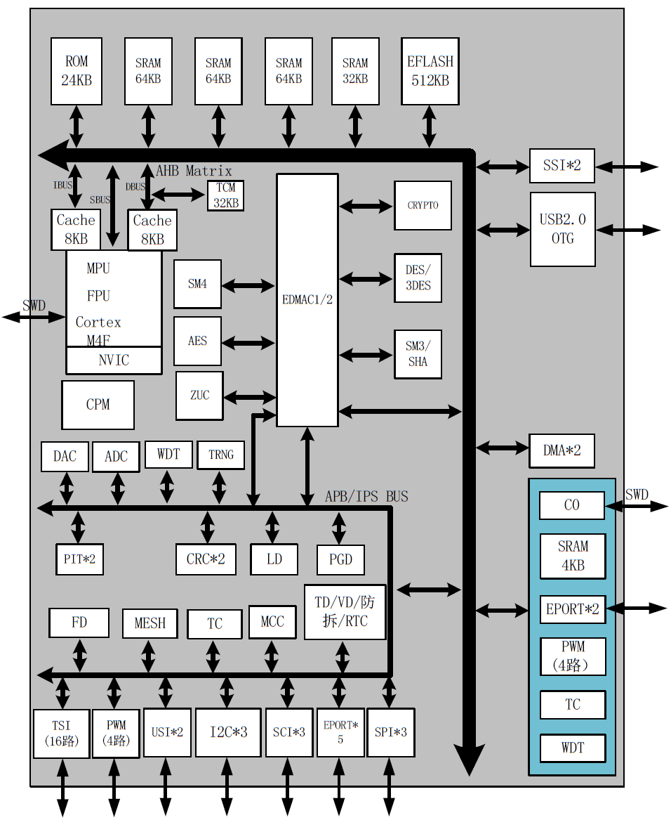 CCM4202S is designed with discrete Cortex-M4 and C*Core C0 cores. It is distinguished by low power consumption, high performance, multifunction and high security level. With a security level reaching EAL5+ and Level II of national commercial cypher code standards. it supports Ali ID2 security chip and application specifications. It can be widely used in fingerprint modules, smart door locks, MPOS products, as well as online banking, mobile payment, data security, secure communication, copyright control, and smart grids. The chip’s typical operating frequency is 120MHz.